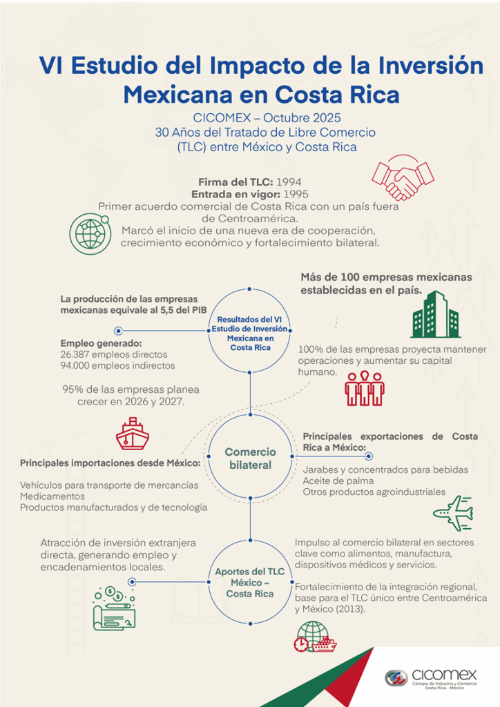 Así lo señalan las principales conclusiones de la sexta edición del Estudio del Impacto de la Inversión Mexicana en Costa Rica, elaborado por la Cámara de Comercio México–Costa Rica (Cicomex).