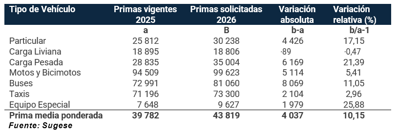 Las primas solicitadas por el INS implican un aumento del 10,15% en la prima media ponderada. Este crecimiento, señalaron, fue fundamentado en la mayor siniestralidad observada. La entidad explicó que el incremento está presente en todos los grupos vehiculares, excepto en carga liviana (disminución de 0,5%).