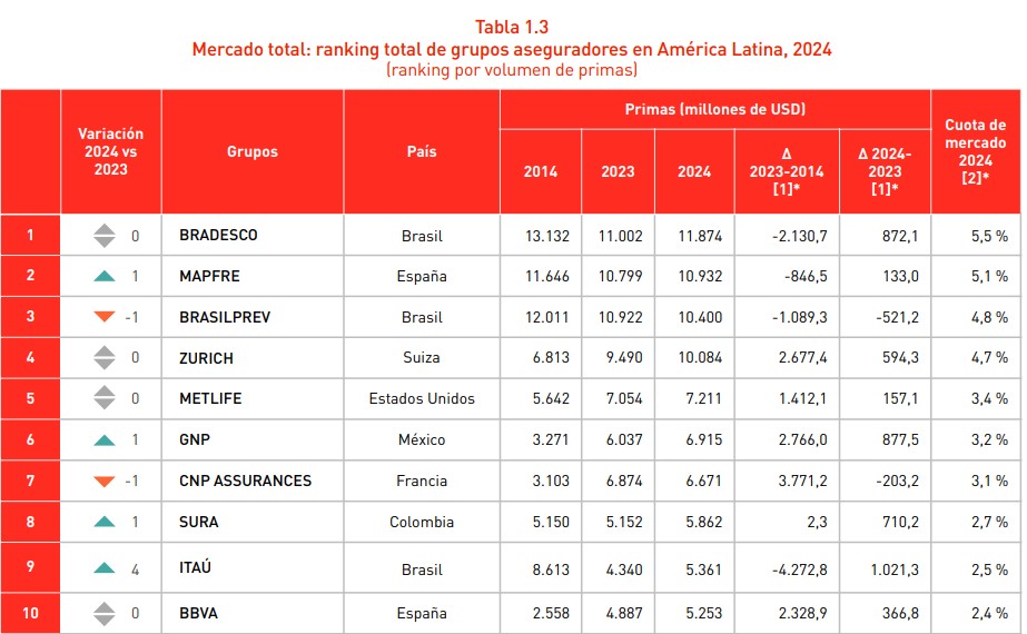 Esta clasificación está encabezada por la mayor aseguradora brasileña, Bradesco, que concentra su operación exclusivamente en ese país, seguida de MAPFRE. Precisamente, esta última mejoró una posición respecto a 2023.