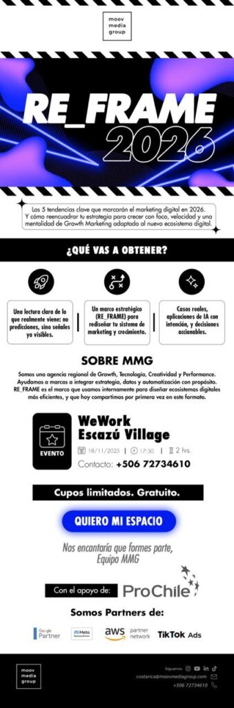 Bajo esa premisa, Moov Media Group (MMG) realizará el evento “RE_FRAME 2026: una nueva forma de pensar el crecimiento digital en Centroamérica”. Este está diseñado para redefinir la forma en que los gerentes de marketing digital y líderes de marketing organizan y ejecutan su crecimiento en un entorno cada vez más complejo en la región.